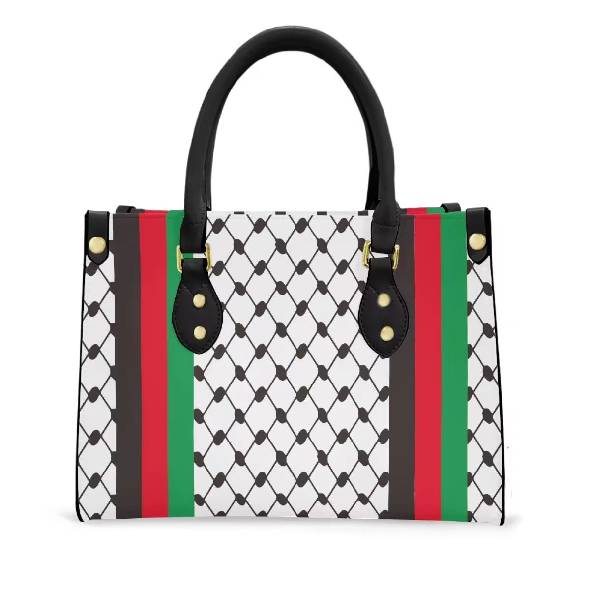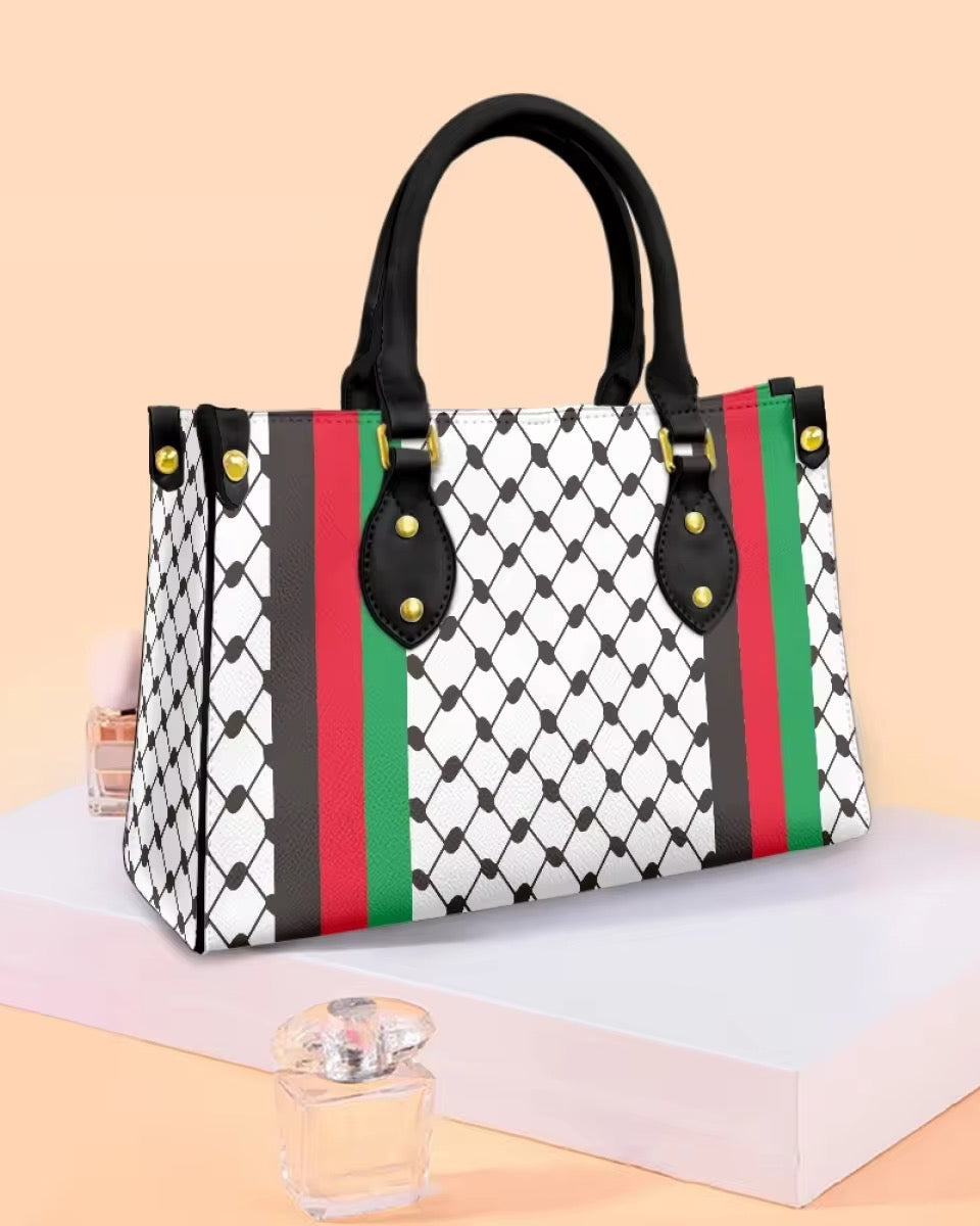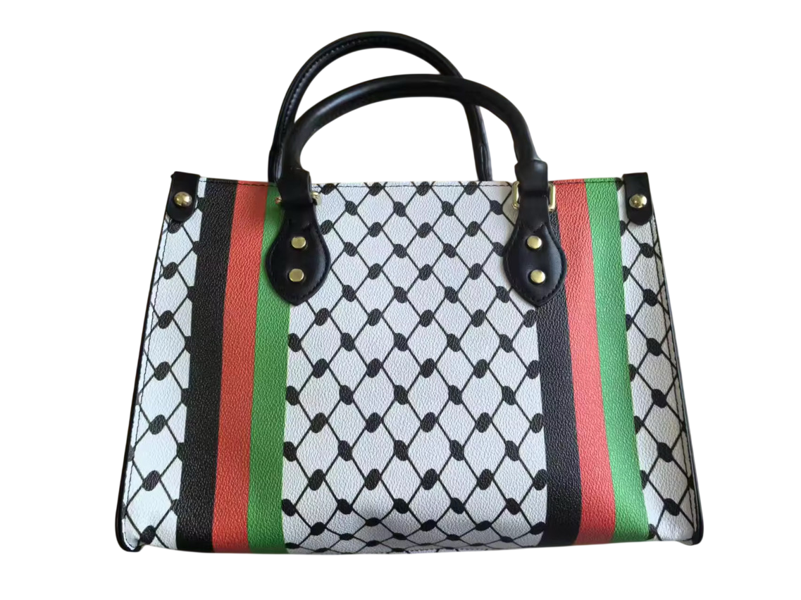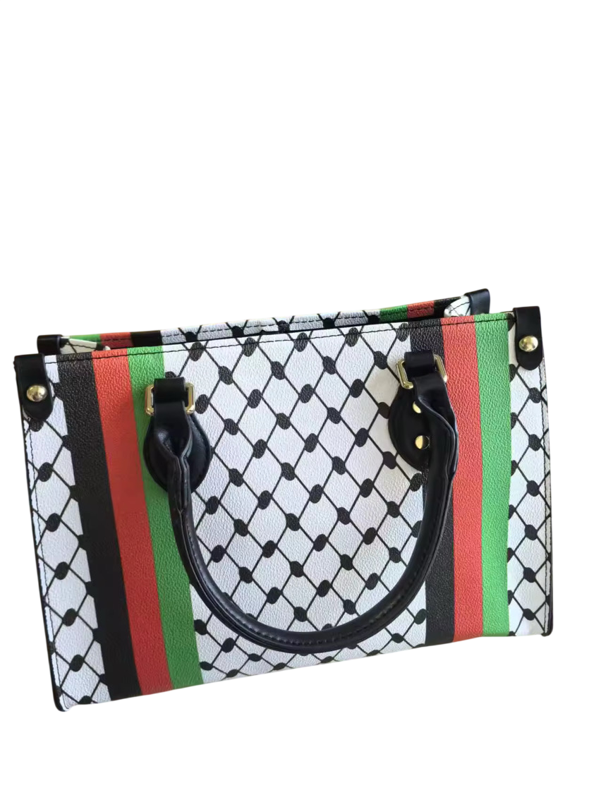 Stijlvolle handtas met het iconische keffiyeh patroon en accenten in de Palestijnse kleuren.