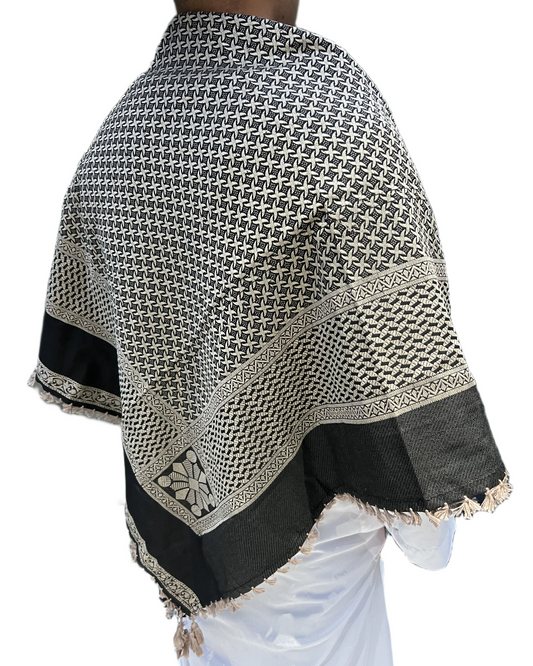 Kufiya/Keffiyeh Negro/Blanco con Flecos Negros 100% Algodón
