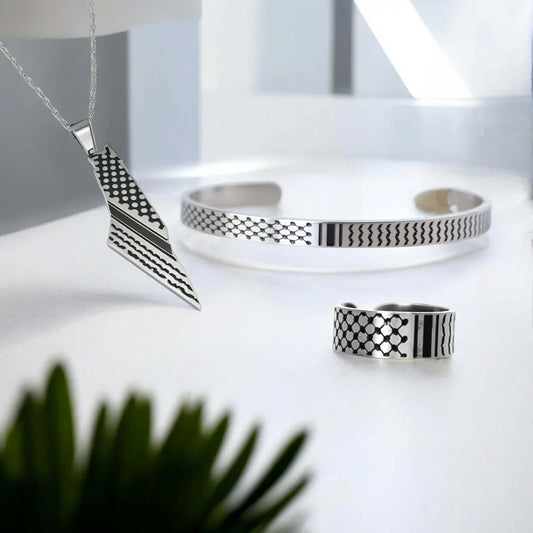 Set de joyas Palestina Oro/Plata – Collar, Pulsera y Anillo con patrón Kufiya