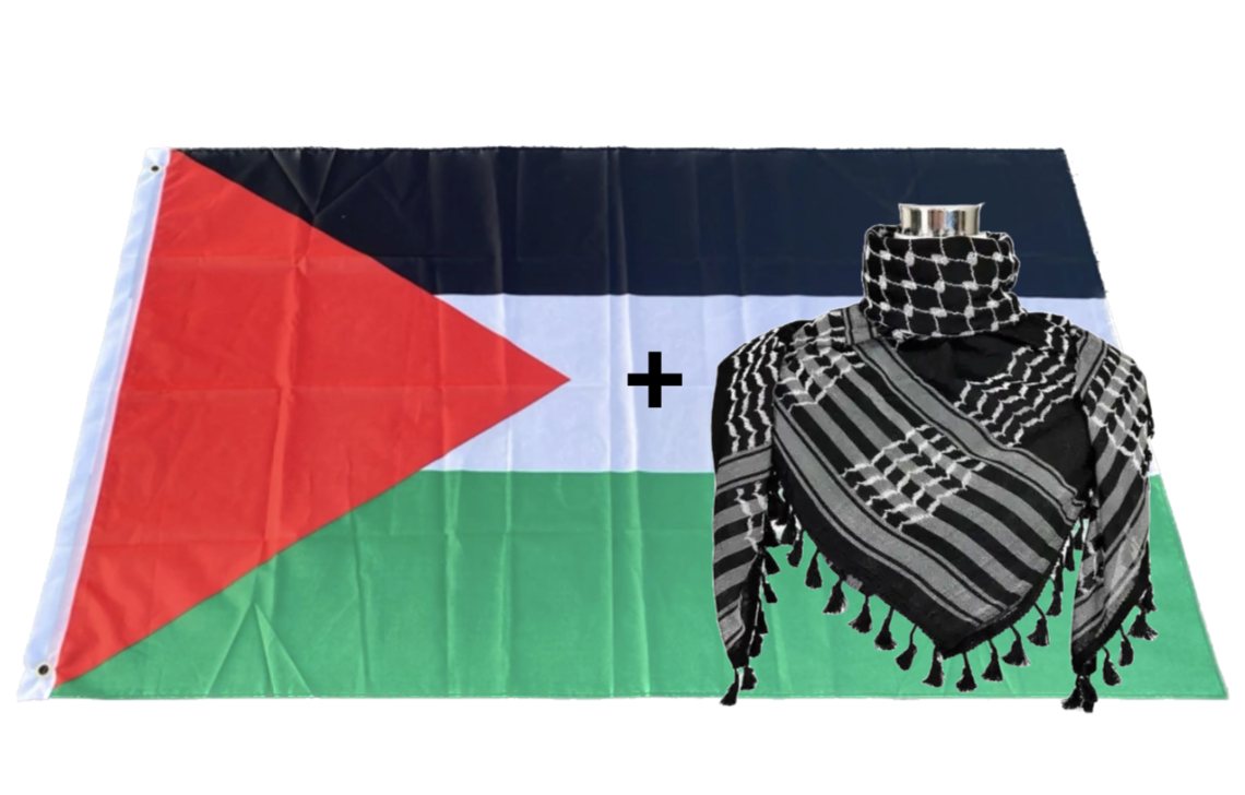 Kufiya/Keffiyeh Negro con Flecos 127x127 cm + Bandera de Palestina 90x150 cm Oferta Combinada