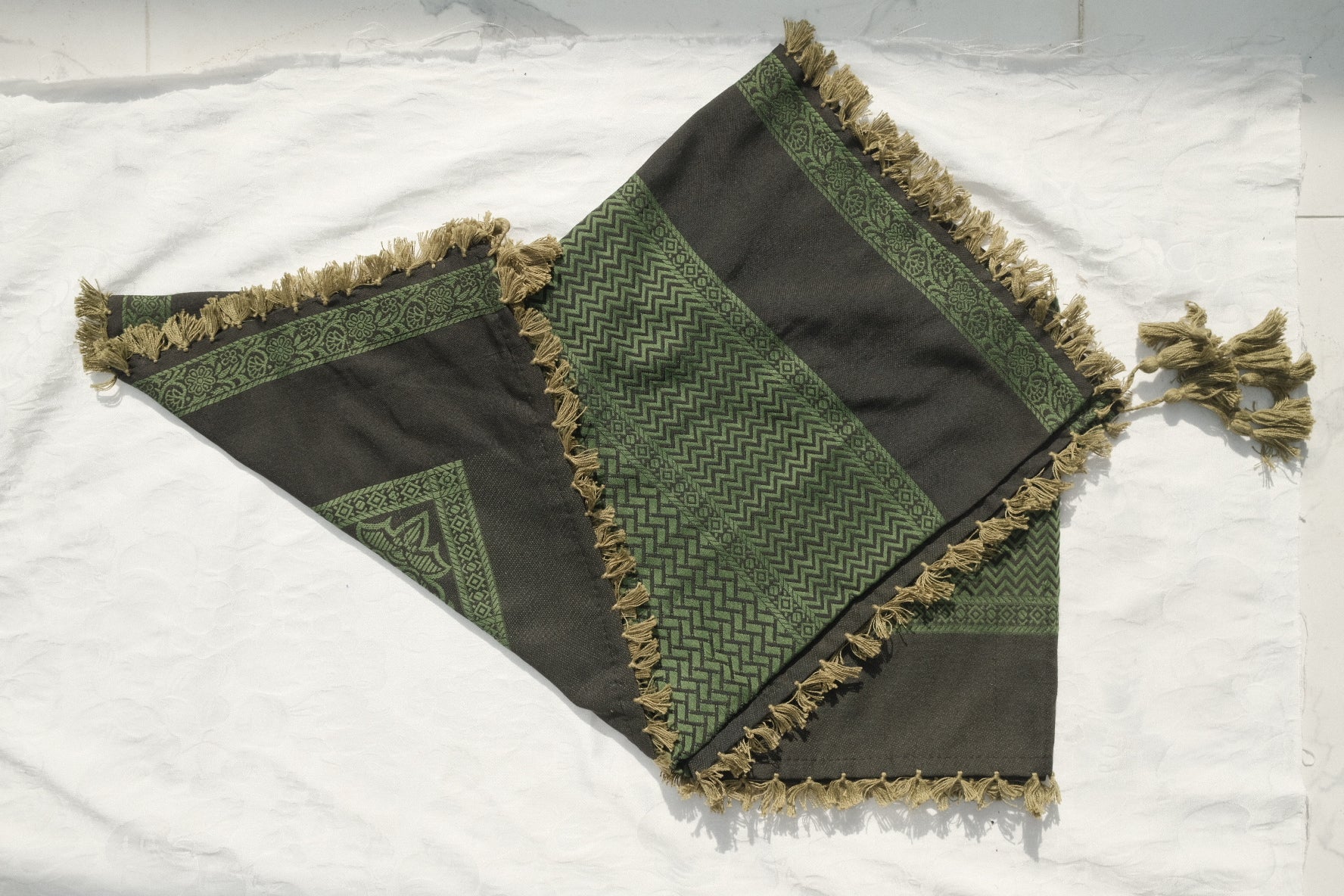 Esta variante está hecha de 100% algodón premium, lo que hace que la tela sea suave al tacto, transpirable y duradera. Los patrones tejidos y los flecos son característicos de la artesanía con la que estos pañuelos se han fabricado durante generaciones.