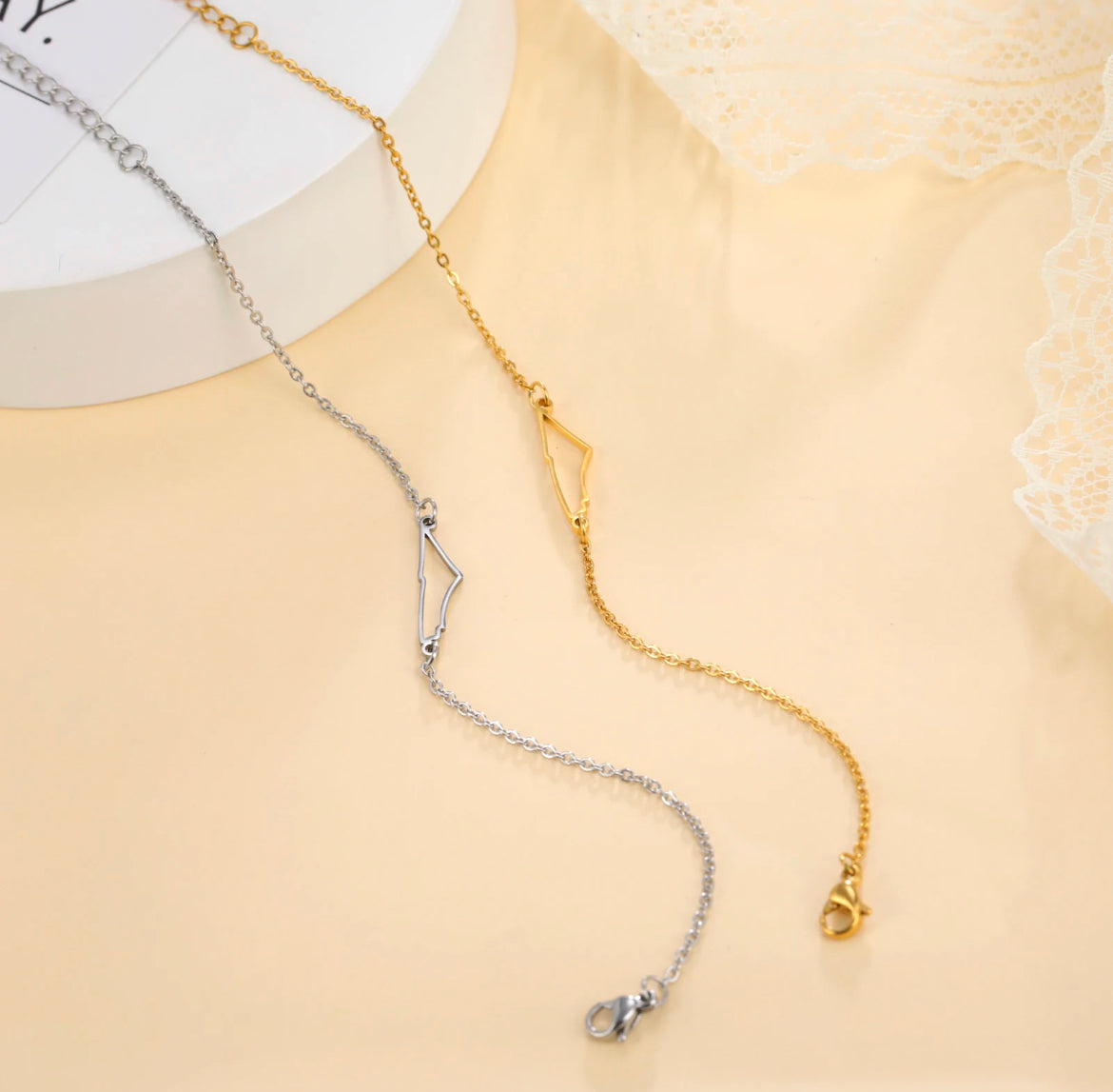 Stråla med stil med vårt guld- eller silverarmband från Palestina. Detta vackra armband är noggrant tillverkat med stor omsorg för detaljer. Den guld-/silverfärgade designen utstrålar elegans och stolthet.